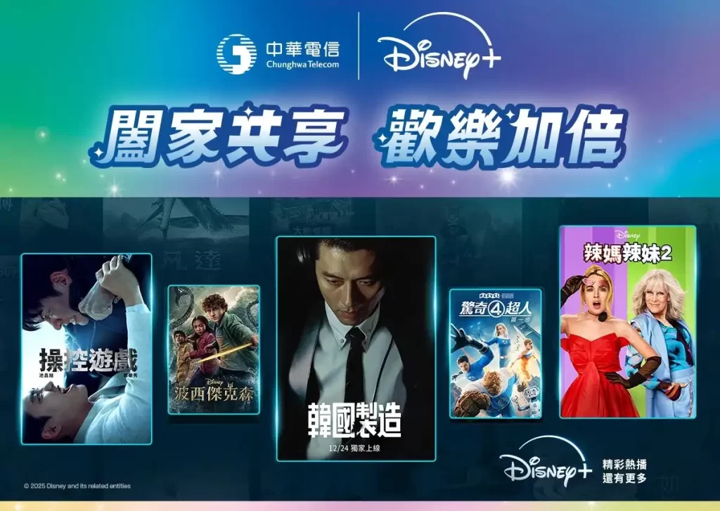 - 行動寬頻用戶首選: 申辦「精采5G」、HiNet光世代「速在必行」或「MOD家速方案」等指定方案,加購 Disney+ 高級方案(原價每月 335 元),首年即可享有不到 75 折 的優惠價。