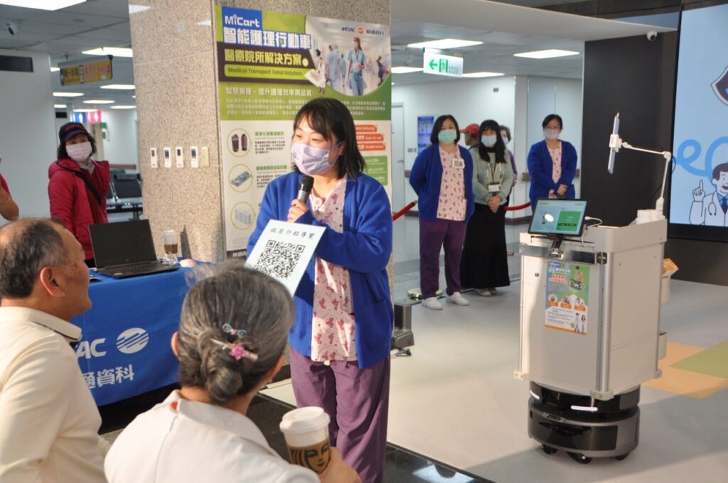 新加入病房團隊的「MiCart智能護理行動車」,結合傳統換藥車、治療車,可承重達100公斤的醫務用品,能夠自動跟隨護理人員巡房給藥路線,也可以指定到位等候護理人員到場施作。透過影像辨識護理人員,護理交班時可即刻辨識轉換。